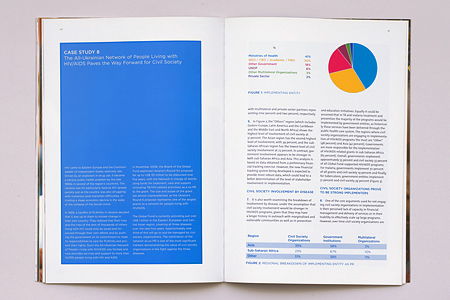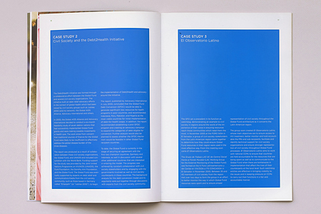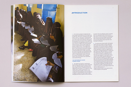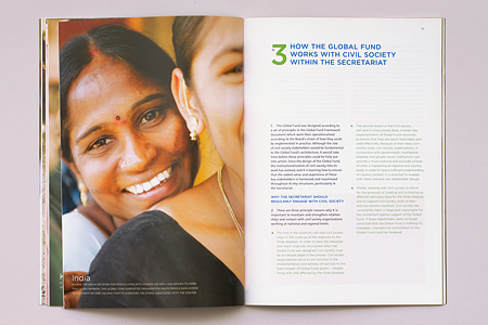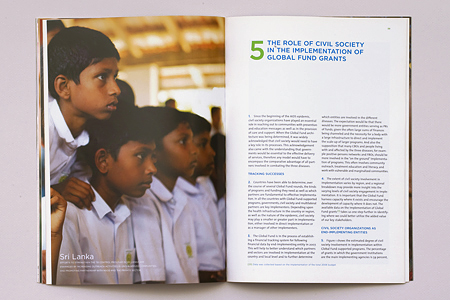 Typeset in five languages, this report describes the ongoing partnership between Civil Society and the Global Fund to fight AIDS, Tuberculosis and Malaria in developing countries.