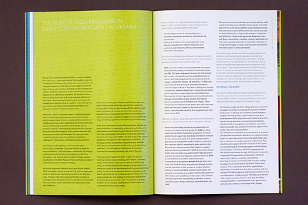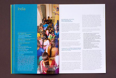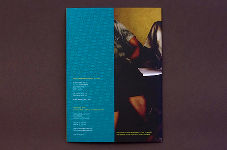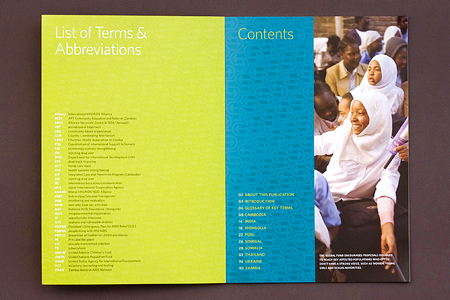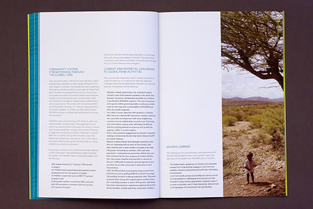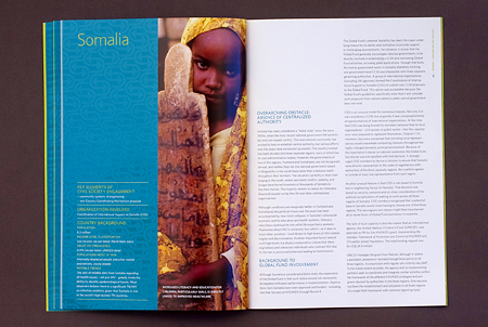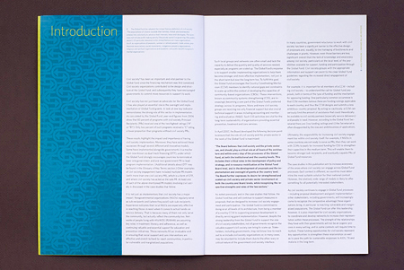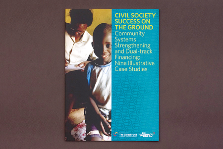 The brochures arrow patterns and twin-column design reflect the dual-track financing and team management of Civil Society and The Global Fund in their worldwide projects combating AIDS, Tuberculosis and Malaria. Typeset in three languages.